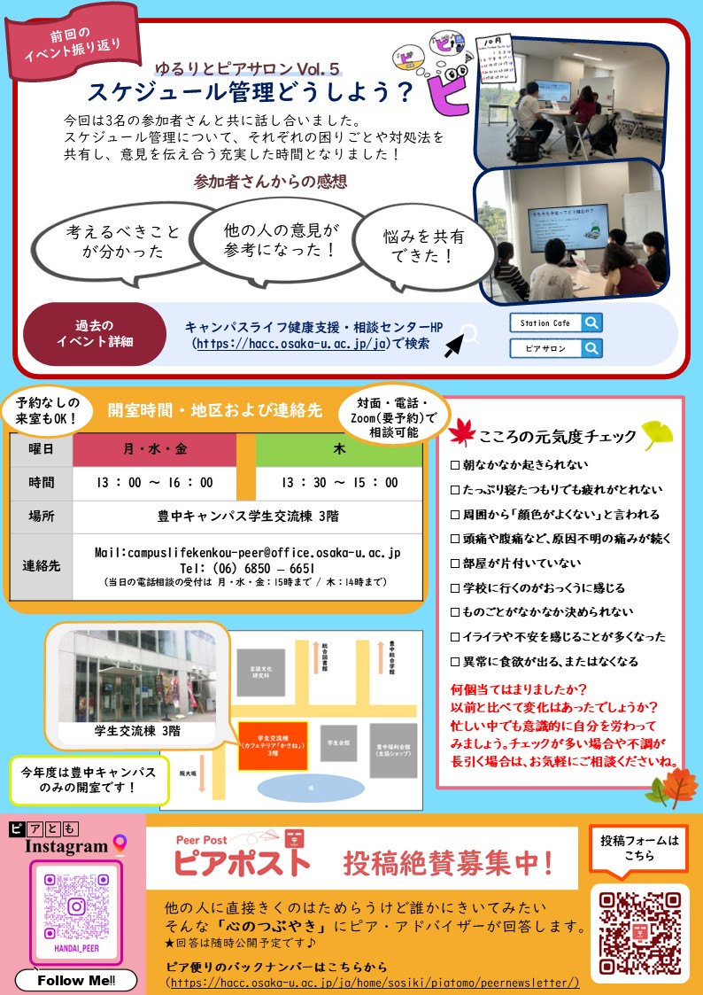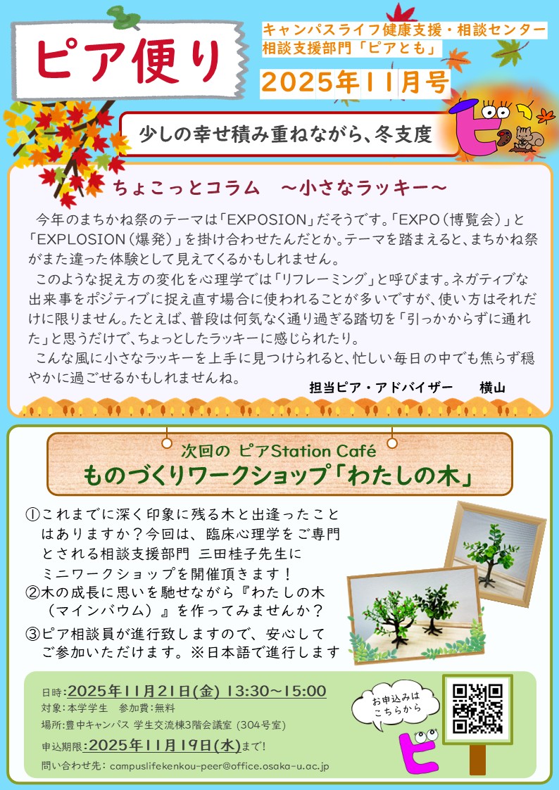 ピア便り 2025年11月号 発行のお知らせ 2025年10月30日2025年10月30日 投稿者: 永井友幸ピア便り 2025年11月号 発行のお知らせ「ピアとも」の活動をもっと広く知っていただくため、ピア・アドバイザーが中心となって「ピア便り」を作成、発行しています。 ピア便り 2025年11月号が発行できましたので、是非ご覧ください【PDF】。